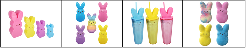 - Peeps Geometric Easter Bunny Patterned 24.5 oz. Double Wall Tumbler | $5.00 each10″ Peeps Bunny Plush | $3.00 each