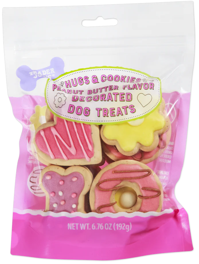 An array of treats decorated in four distinct styles: red hearts with pink stripes, purple bones with red, white, and pink sprinkles, yellow flowers, and even pink donuts with a dark brown drizzle. They’re made with a base of wheat flour, ground flaxseed, and dried egg, and flavored with Peanut Butter.